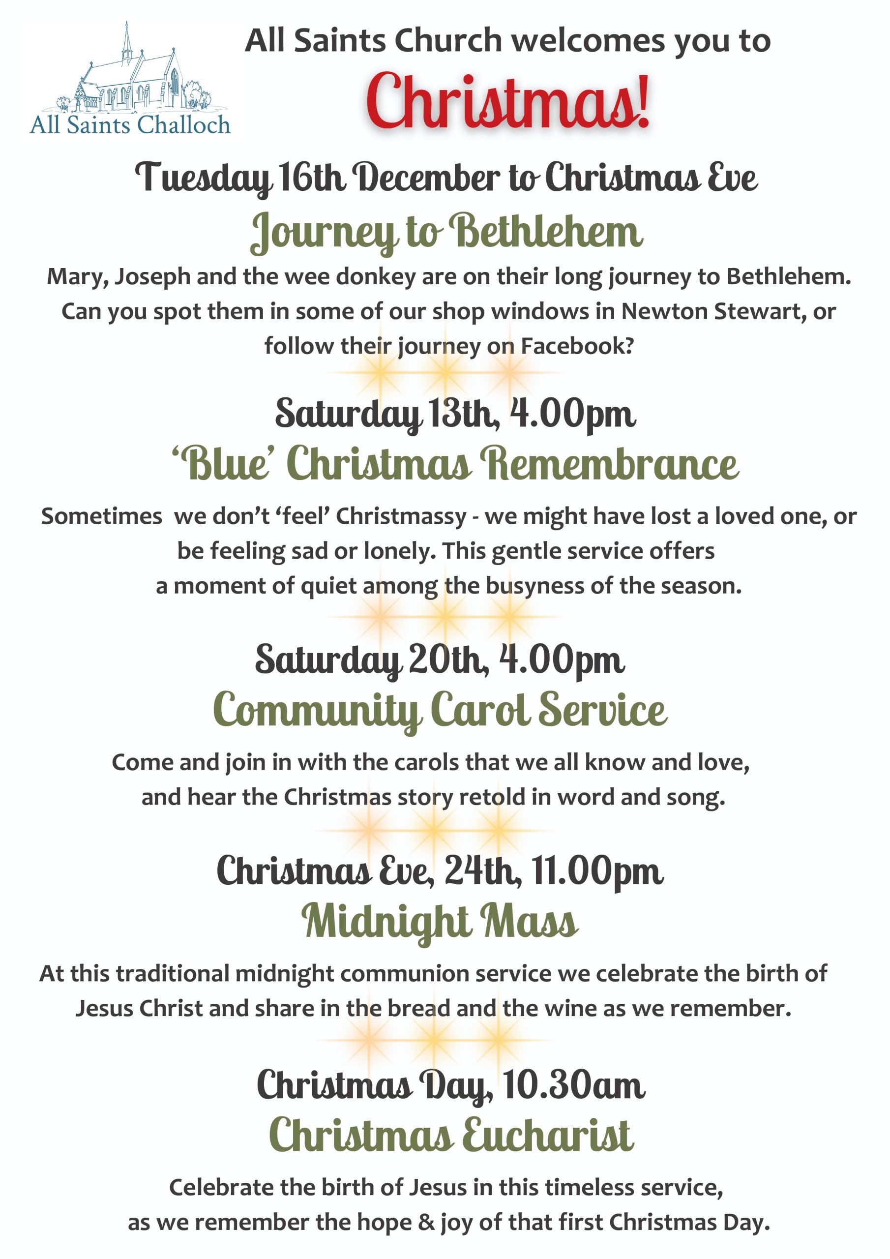 Satnav: the postal address is: All Saints Episcopal Church, Challoch, Newton Stewart, DG8 6RB