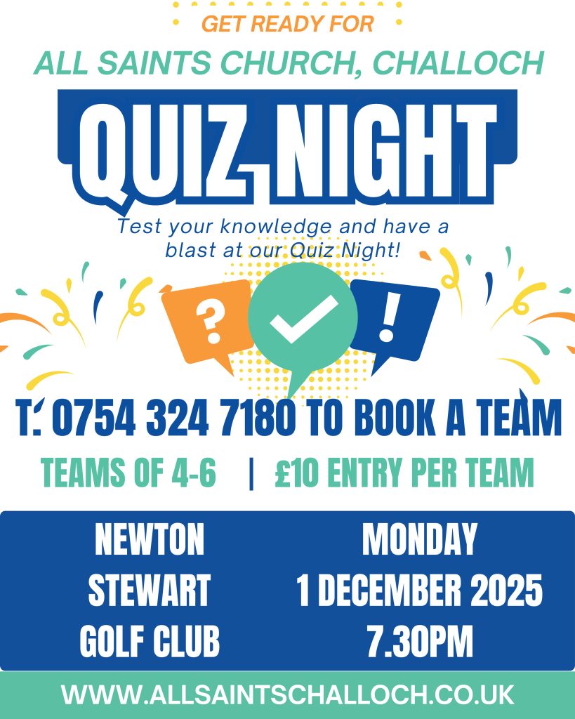 Get the festive season off to a cerebral bang by entering the All Saints’ Challoch Annual Christmas Quiz at Newton Stewart Golf Club (2 Kirroughtree Avenue, DG8 6PF) on Monday, 1 December at 7.30pm. The entry fee is £10 per team of four to six people. Pre-book to avoid disappointment! For team entry bookings, phone All Saints’ Episcopal Church on 07543 247 180, or email: allsaintschalloch@gmail.com . A cash bar will be available on the evening, and there are prizes to be won!